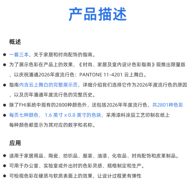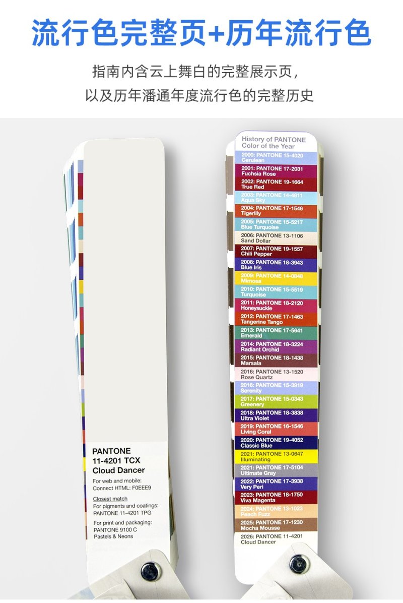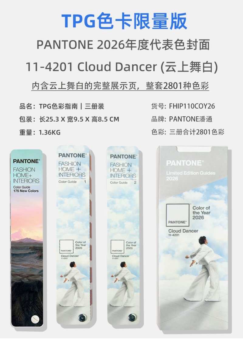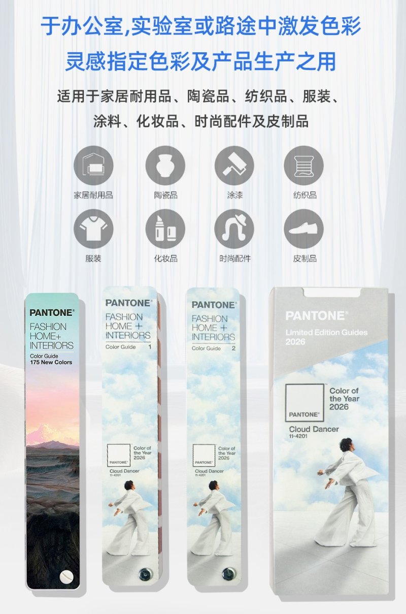 • 为了展示色彩在产品上的效果,《时尚、家居及室内设计色彩指南》现推出限量版,以庆祝潘通2026年度流行色:PANTONE 11-4201 云上舞白。