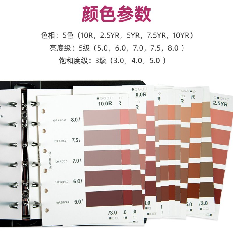 颜色参数 色相:5色(10R,2.5YR,5YR,7.5YR,10YR) 亮度级:5级(5.0,6.0,7.0,7.5,8.0 ) 饱和度级:3级(3.0,4.0,5.0 )