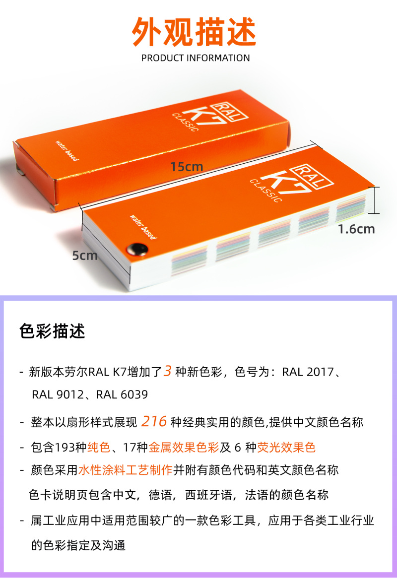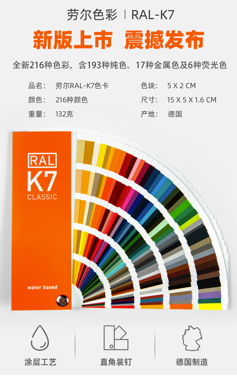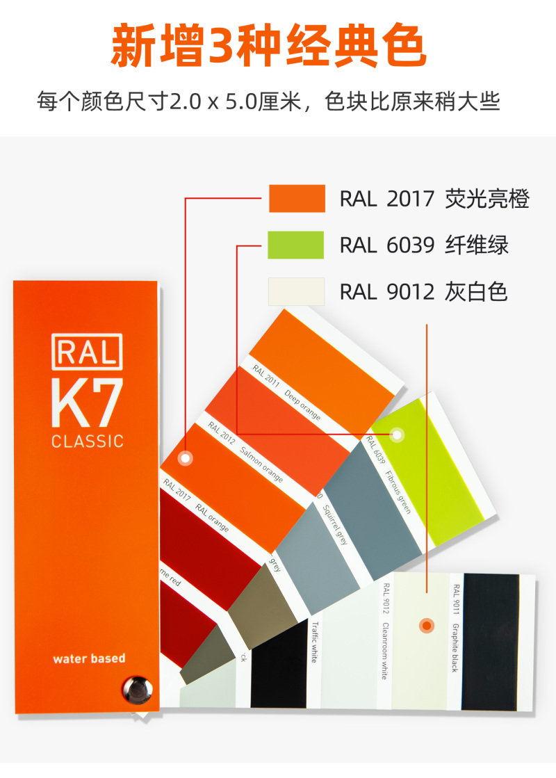 • RAL劳尔K7包含216种经典颜色,比上一版本增加RAL 6039,RAL 2017、RAL 9012三种新增色,新的版本带中文颜色名称,便于对色彩的理解