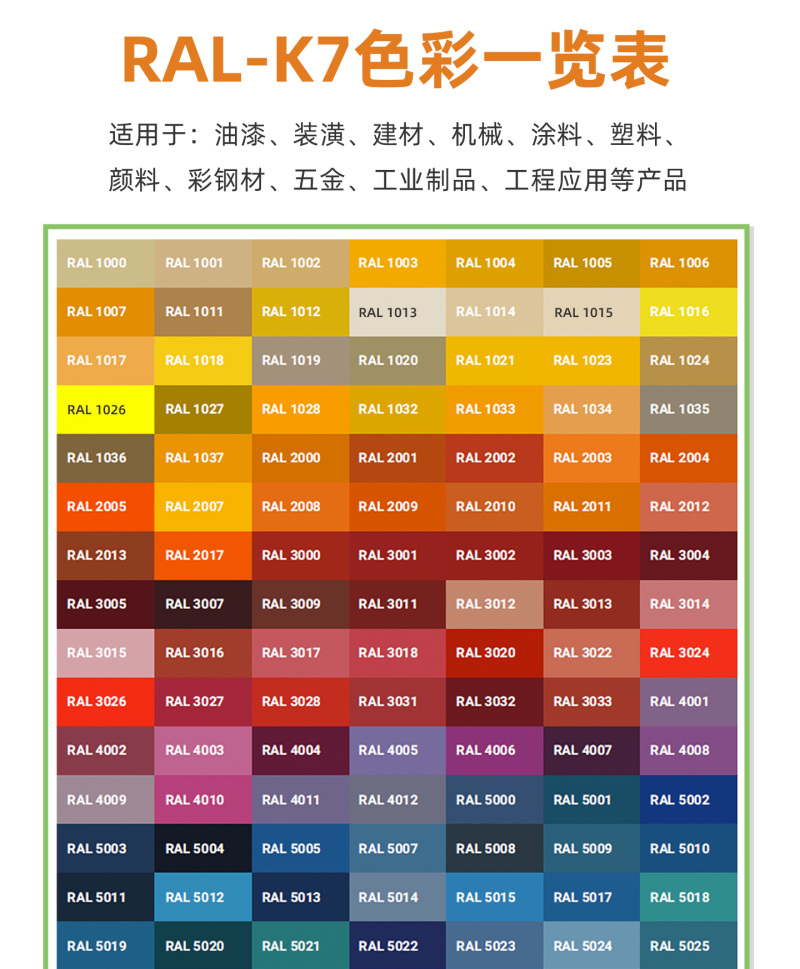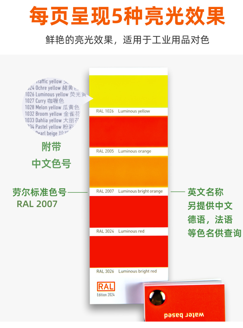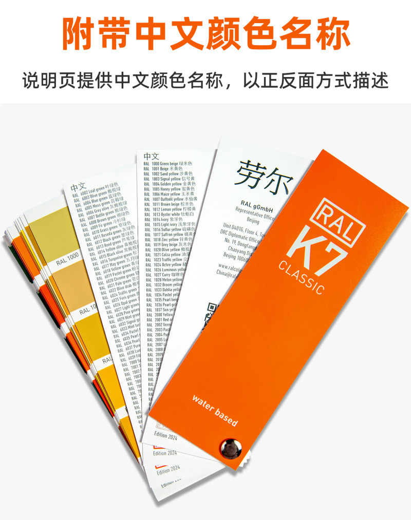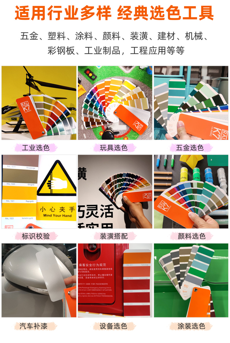 • RAL劳尔K7包含216种经典颜色,比上一版本增加RAL 6039,RAL 2017、RAL 9012三种新增色,新的版本带中文颜色名称,便于对色彩的理解