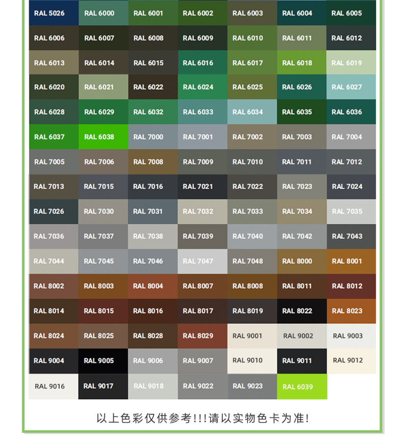 • 颜色采用水性涂料工艺制作并附有颜色代码和英文颜色名称