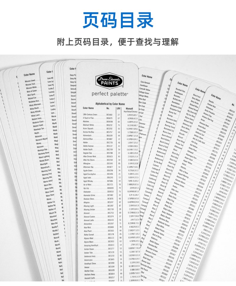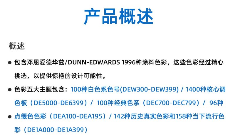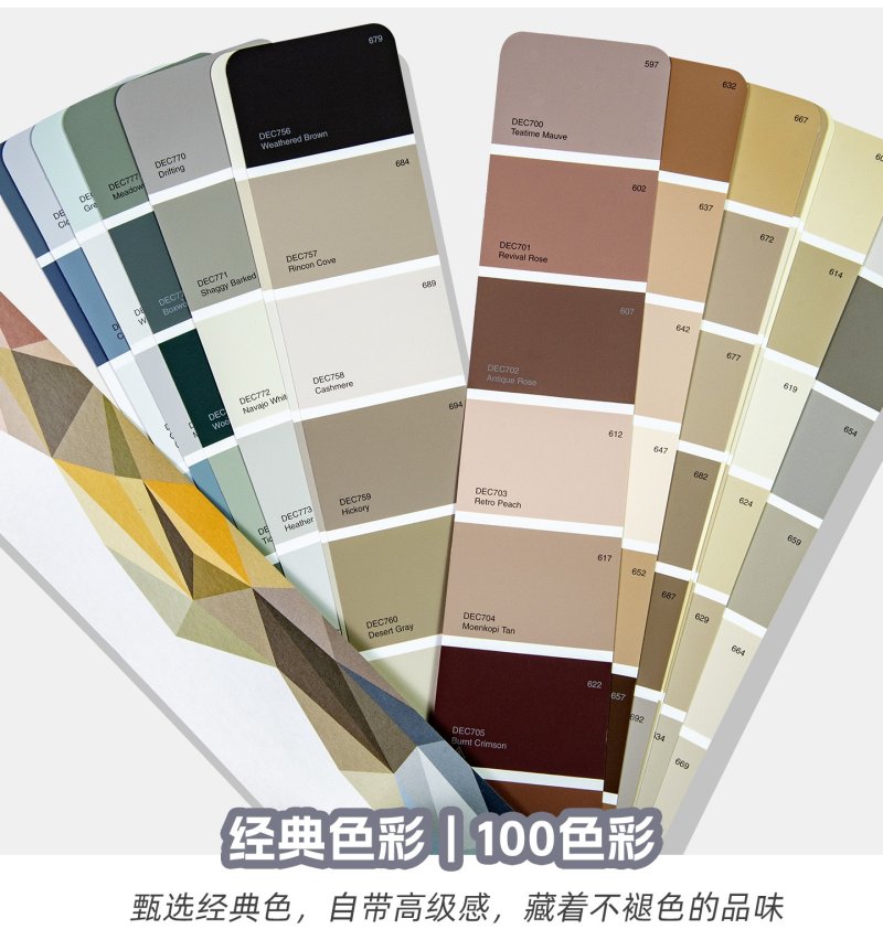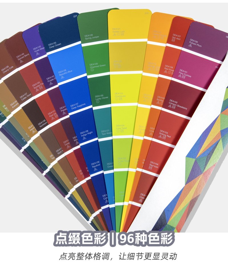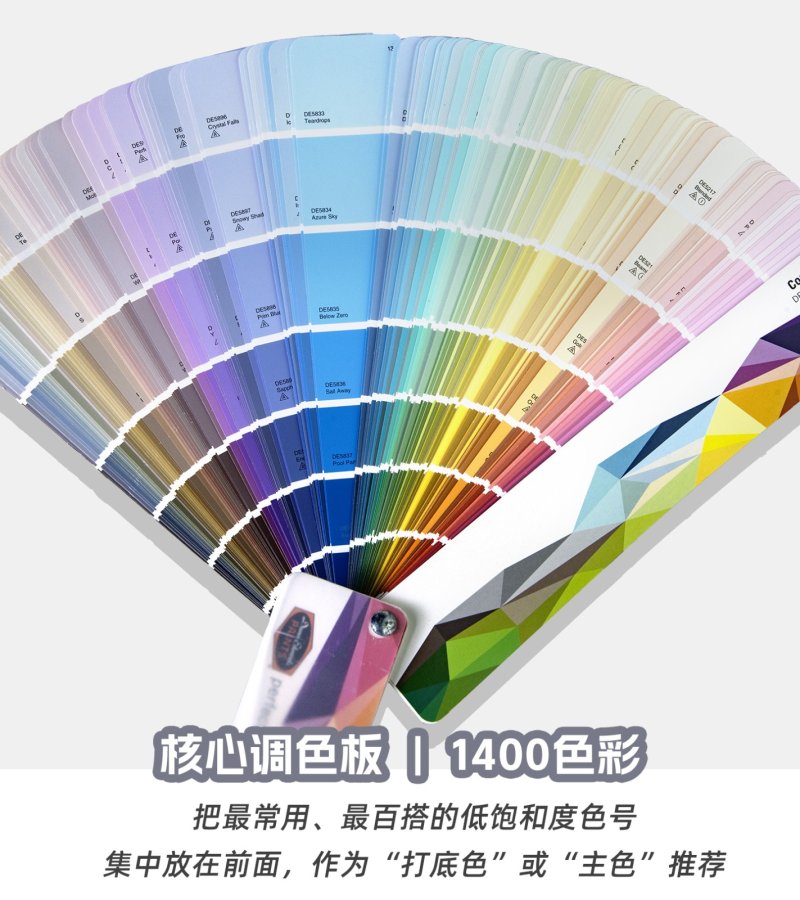 100种白色系色号(DEW300-DEW399)/1400种核心调色板(DE5000-DE6399)/ 100种经典色系(DEC700-DEC799)/ 96种点缀色色彩(DEA100-DEA195)/142种历史真实色彩和158种当下流行色彩(DE1A000-DE1A399)