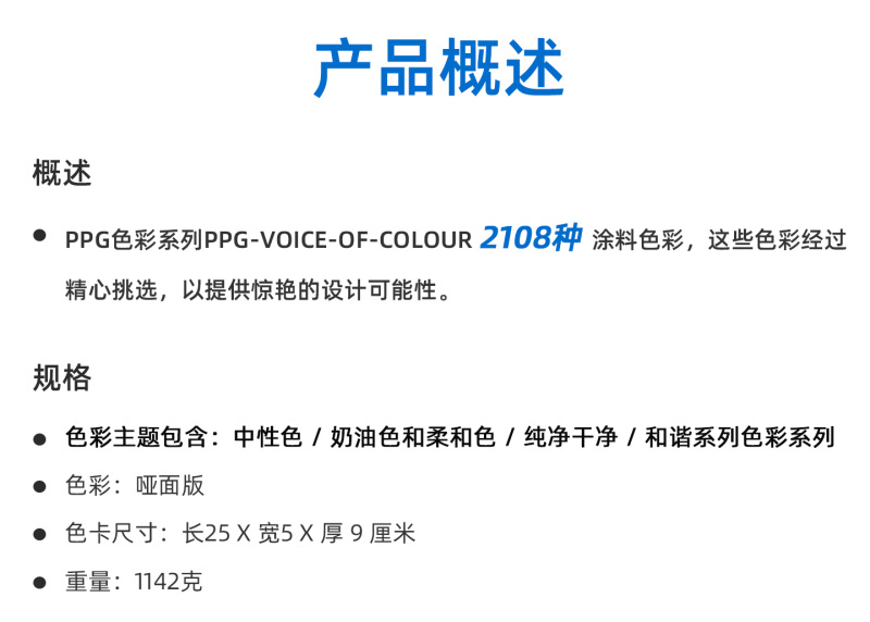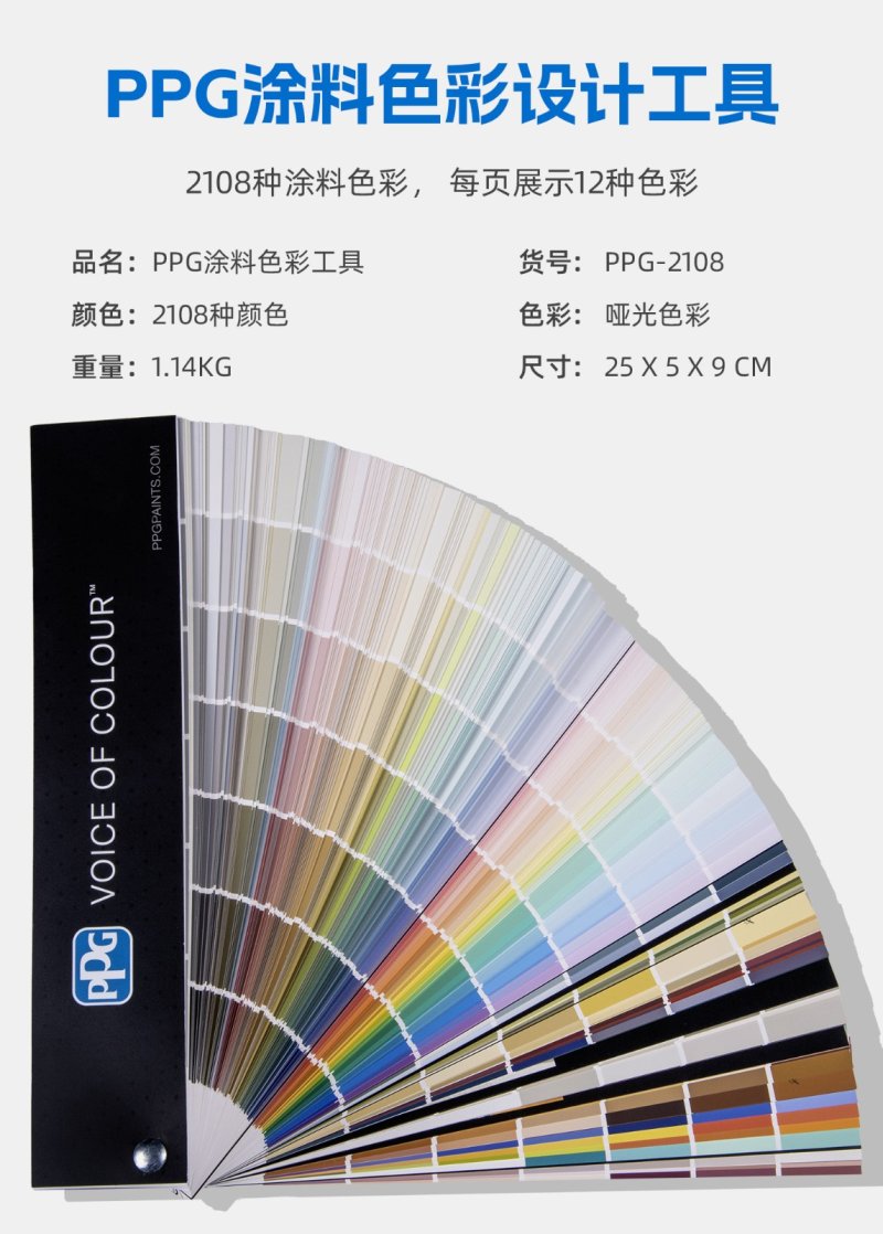 包含PPG色彩系列PPG-Voice-of-Colour 2108种涂料色彩,这些色彩经过精心挑选,以提供惊艳的设计可能性。