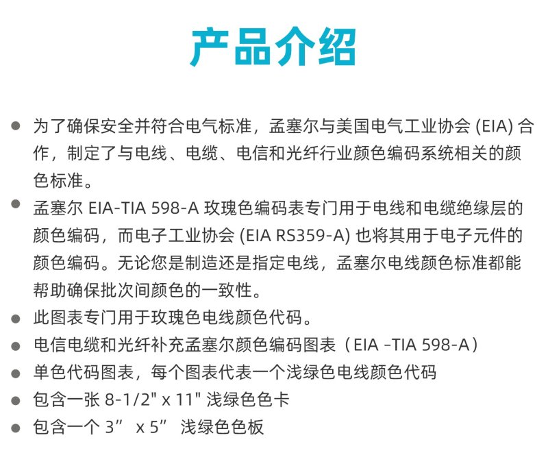 为了确保安全并符合电气标准,孟塞尔与美国电气工业协会 (EIA) 合作,制定了与电线、电缆、电信和光纤行业颜色编码系统相关的颜色标准。孟塞尔 EIA-TIA 598-A 浅绿色颜色编码表专门用于电线和电缆绝缘层的颜色编码,而电子工业协会 (EIA RS359-A) 也将其用于电子元件的颜色编码。无论您是制造还是指定电线,孟塞尔电线颜色标准都能帮助确保批次间颜色的一致性。此图表专门用于浅绿色电线颜色编码。