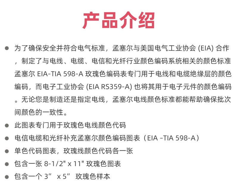 为了确保安全并符合电气标准,孟塞尔与美国电气工业协会 (EIA) 合作,制定了与电线、电缆、电信和光纤行业颜色编码系统相关的颜色标准。孟塞尔 EIA-TIA 598-A 玫瑰色编码表专门用于电线和电缆绝缘层的颜色编码,而电子工业协会 (EIA RS359-A) 也将其用于电子元件的颜色编码。无论您是制造还是指定电线,孟塞尔电线颜色标准都能帮助确保批次间颜色的一致性。此图表专门用于玫瑰色电线颜色代码。