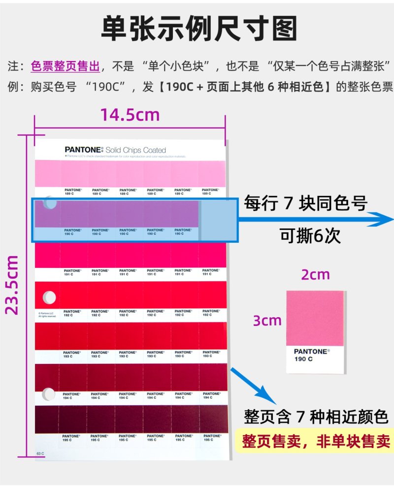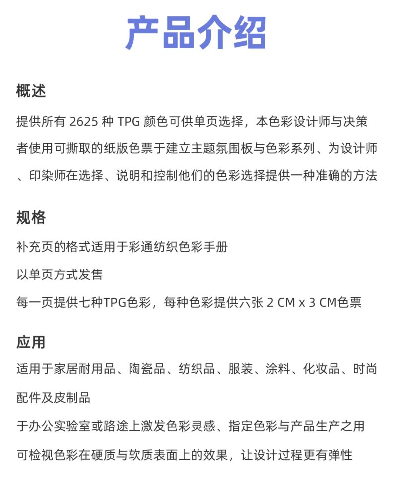 • 整页尺寸近似A4大小,彩通纺织色彩手册补充页-纸版,2625种TPG颜色可供独立选购。